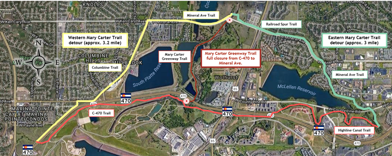 - Eastern detour: Follow the Highline Canal Trail to Southpark Lane. Take the Mineral Avenue Trail. After crossing Santa Fe Drive, continue on the Railroad Spur Trail back onto Mary Carter Greenway Trail. Detour is approximately 3 miles, 1 mile shorter than original route.