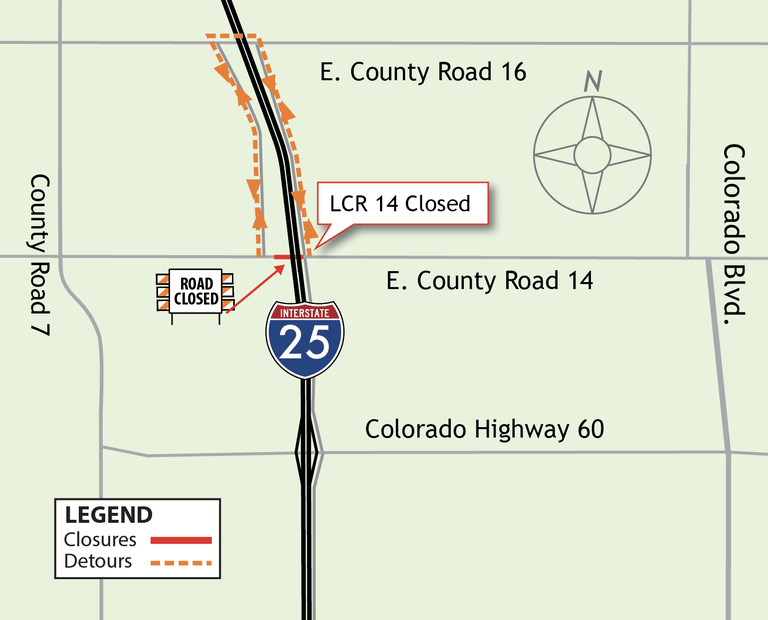 - Westbound LCR 14 traffic will take the eastern Frontage Road north to E. County Road 16, turn and take the western Frontage Road south, turn right and continue westbound on LCR 14.