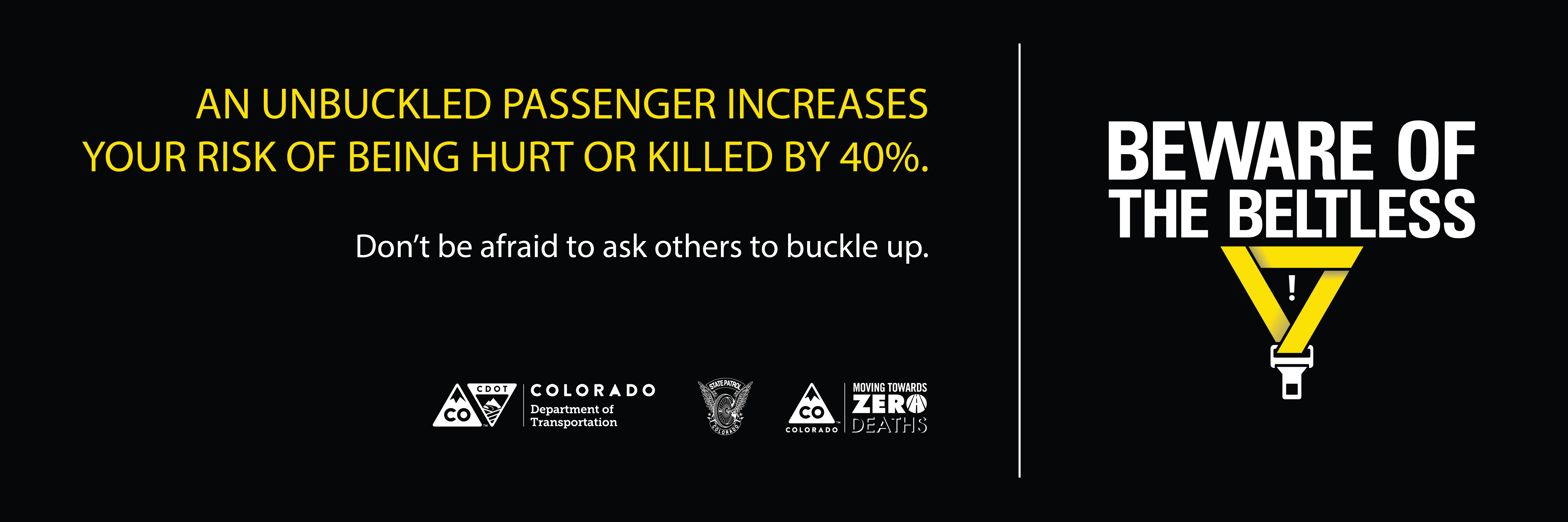 You are here: Home Safety Seat Belts Remove Year of the Seat Belt beware unbuckled english beware unbuckled english https://www.codot.gov/safety/seatbelts/remove/year-of-the-seat-belt/beware-unbuckled-english.png/view https://www.codot.gov/safety/seatbelts/remove/year-of-the-seat-belt/beware-unbuckled-english.png/@@download/image/beware-unbuckled-english.png beware unbuckled english Click to view full-size image… Size: 271.0 KB